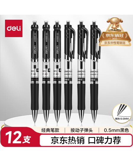 得力(deli)S01中性笔签字笔 0.5mm经典办公按动笔水笔 黑色 12支/盒