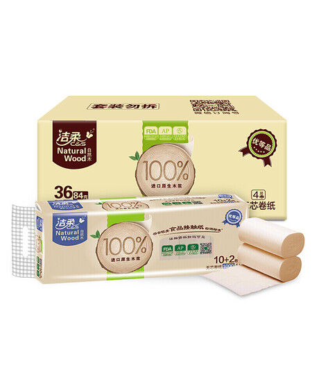 洁柔卷纸 自然木食品级无芯加厚4层84g卫生纸*36卷 母婴健康用纸实芯