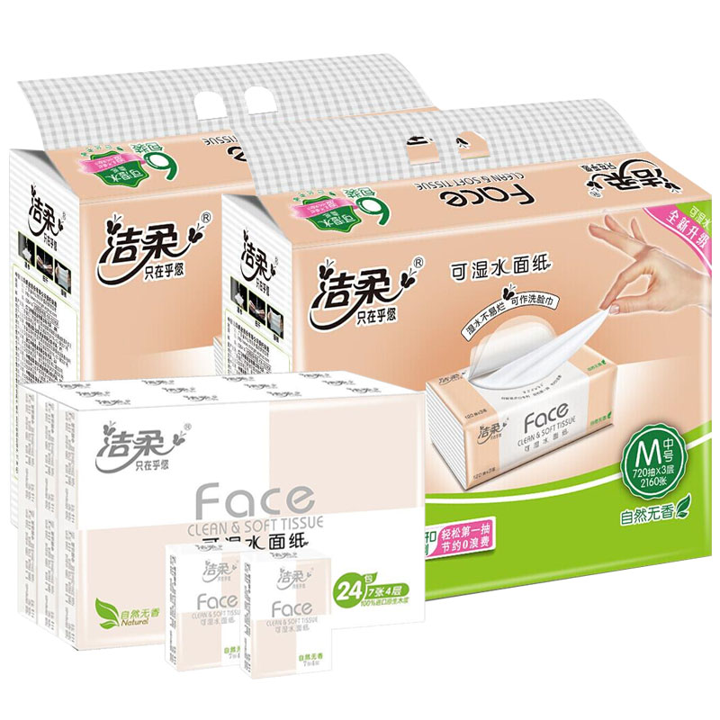【洁柔组合】 洁柔(C&S)抽纸 粉Face 柔韧3层120抽面巾纸*6包*2提+手帕纸 自然无香加厚4层面巾纸7片*24包 超迷你便携式小包餐巾纸 无香干湿两用 新老包装交替发货