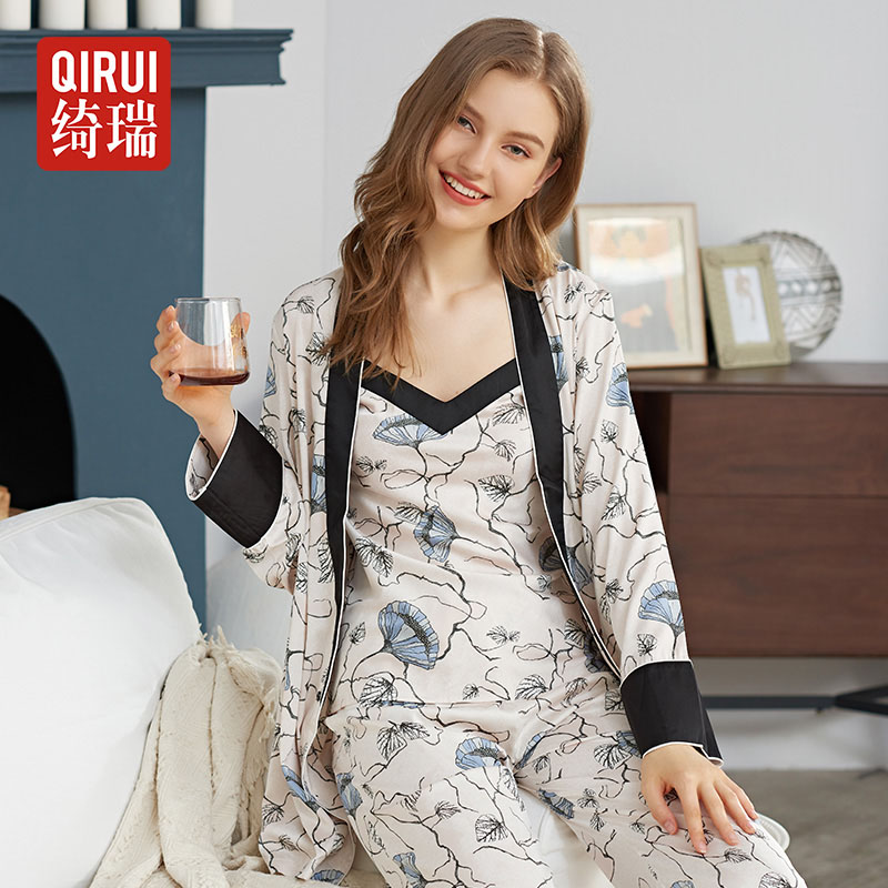 绮瑞绮瑞春夏季仿丝吊带长袖长裤薄款宽松性感女士家居服三件套QJ22936