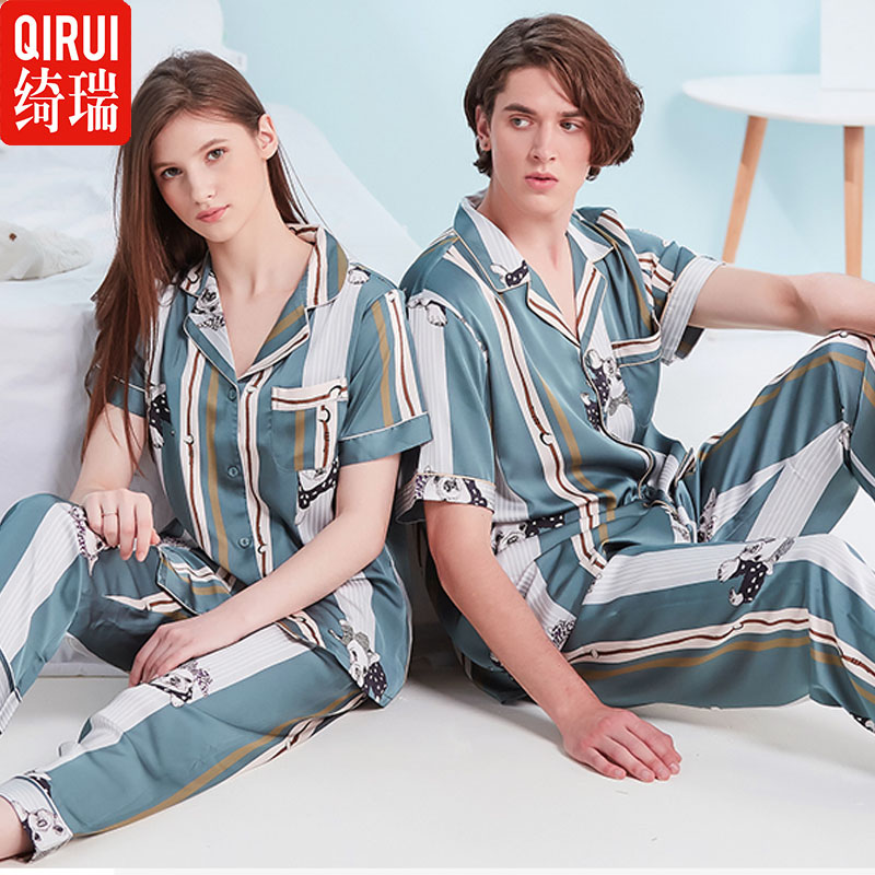绮瑞绮瑞情侣睡衣夏季男女长裤短袖仿丝睡衣套装薄款开衫可外穿家居服AK12807