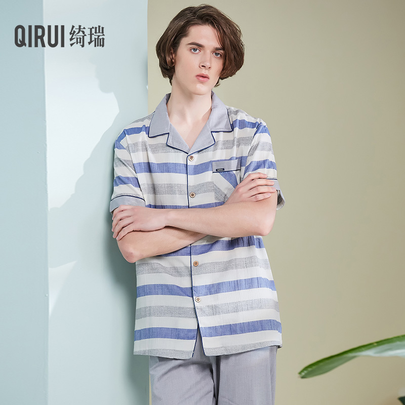 绮瑞绮瑞夏季男士棉麻睡衣夏天纯棉开衫条纹全棉短袖长裤家居服套装QJ14414