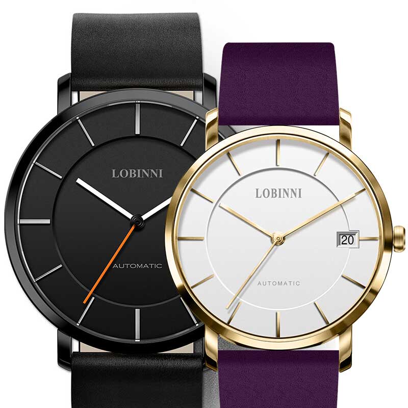 罗宾尼(LOBINNI)情侣手表一对男女士超薄全自动机械表时尚休闲时尚瑞士风格腕表防水皮带 5016LM情侣表一对(男黑黑+女金白紫)